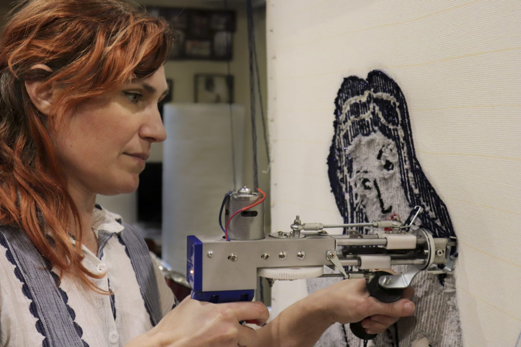 La dernière étape consiste à tondre le tapis pour égaliser les fibres et en faire un joli rendu. Je nettoie les lignes et les détails aux ciseaux et à la tondeuse, j’ajoute de la feutrine au dos et un crochet pour les décorations murales.