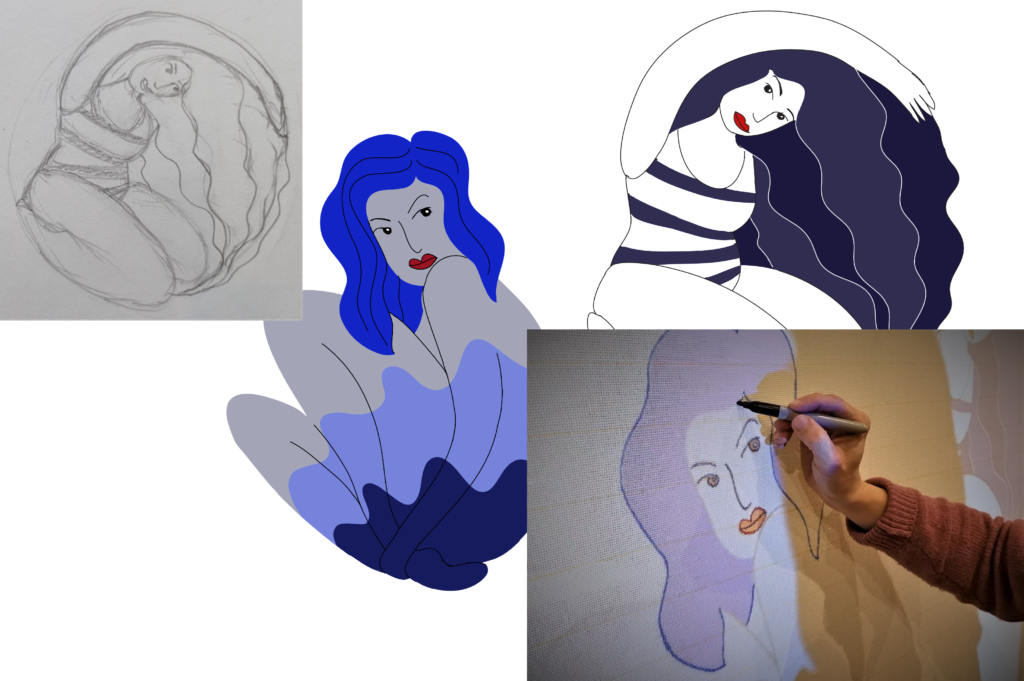 Tout commence avec une inspiration, une idée et un petit croquis. Ensuite, j’en fait une version sur ordinateur, je me fait un plan de couleurs et avec l’aide d’un projecteur je trace mon dessin sur ma toile de base.
