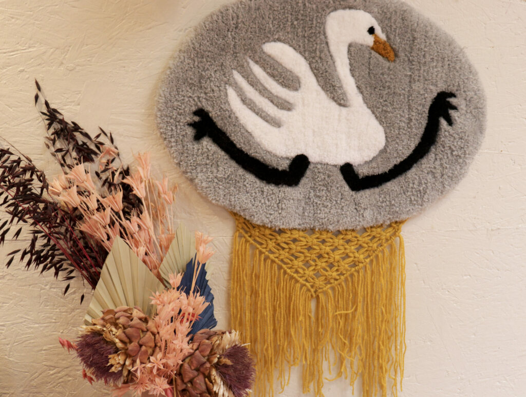 Je choisi mon fil ou laine pour le projet, je prépare mes pelotes et je commence le ”tufting”. Une fois complété, j’applique une colle à tapis de haute qualité à l’arrière pour tout sécuriser.