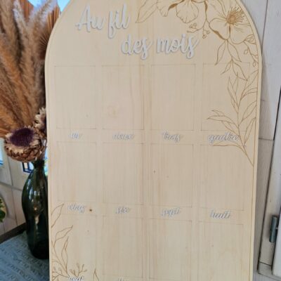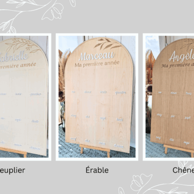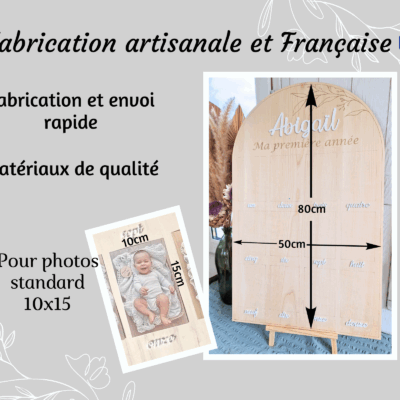 Grand panneau en bois en forme d’arche pour afficher des photos au format standard (10x15cm) des 12 premiers mois d’un bébé. Super accessoire pour l’anniversaire de 1 an, une belle décoration pour la chambre de l’enfant et un beau souvenir. Dimensions : 80×50 cm Choix des essences de bois en contre plaqué 5mm : Peuplier…