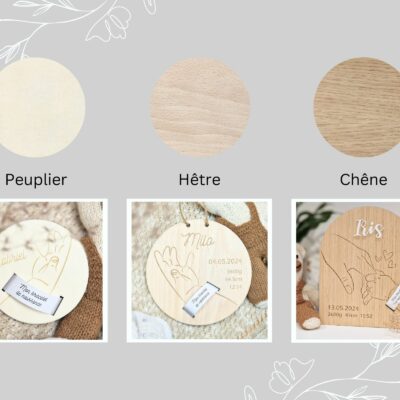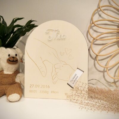 Plaque en bois gravée, pour afficher le bracelet de naissance d’hôpital. Personnalisée avec le prénom en acrylique blanc et les informations de naissance gravées (date, heure, poids et taille). Jolie décoration et souvenir pour la chambre de bébé. Matériel : Cp peuplier ou chêne 5mm et acrylique blanc 3mm ——————————————————————————————————– Fabrication artisanale et française N’hésitez…