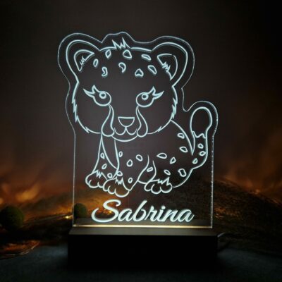 Veilleuse/lampe de table guépard, personnalisable avec un prénom ou une courte phrase. – Parfait accessoire pour une chambre d’enfant. Éclaire tout en douceur un petit coin de la pièce. – Joli cadeau personnalisé (anniversaire, mariage, Noël, fête des mères, saint-valentin…) Dessins faits de mes mains, gravures et découpes faites par ma découpeuse laser. Sur acrylique…