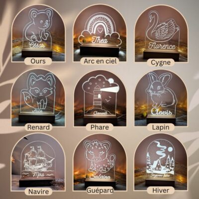 Veilleuse/lampe de table navire, personnalisable avec un prénom ou une courte phrase. – Parfait accessoire pour une chambre d’enfant. Éclaire tout en douceur un petit coin de la pièce. – Joli cadeau personnalisé (anniversaire, mariage, Noël, fête des mères, saint-valentin…) Dessins faits de mes mains, gravures et découpes faites par ma découpeuse laser. Sur acrylique…