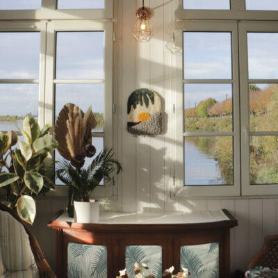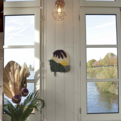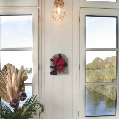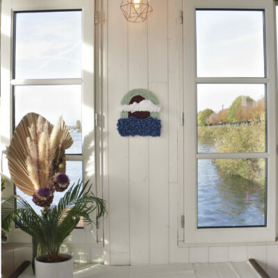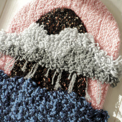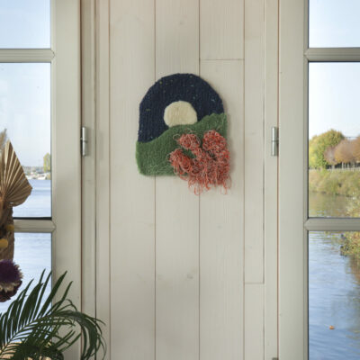 Hand tufted rug wall hanging (designed and made by me) using loop and cut pile tufting guns (which ads different heights and textures) Dimensions: 28 x 35 cm Finished felt back and hook Tapis mural tufté à la main (conçu et fait par moi) en utlisant des pistolets loop et cut pile (ce qui ajoute…