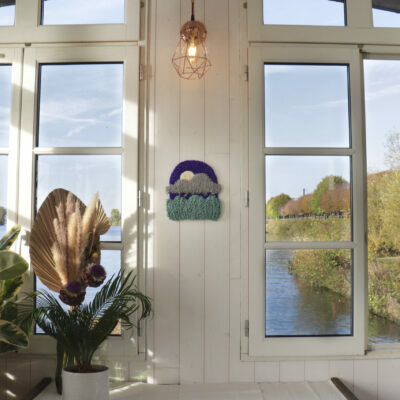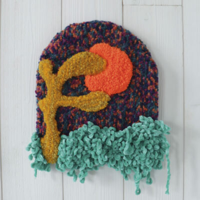Hand tufted rug wall hanging (designed and made by me) using loop and cut pile tufting guns (which ads different heights and textures) Dimensions: 24 x 26 cm Finished felt back and hook Tapis mural tufté à la main (conçu et fait par moi) en utlisant des pistolets loop et cut pile (ce qui ajoute…