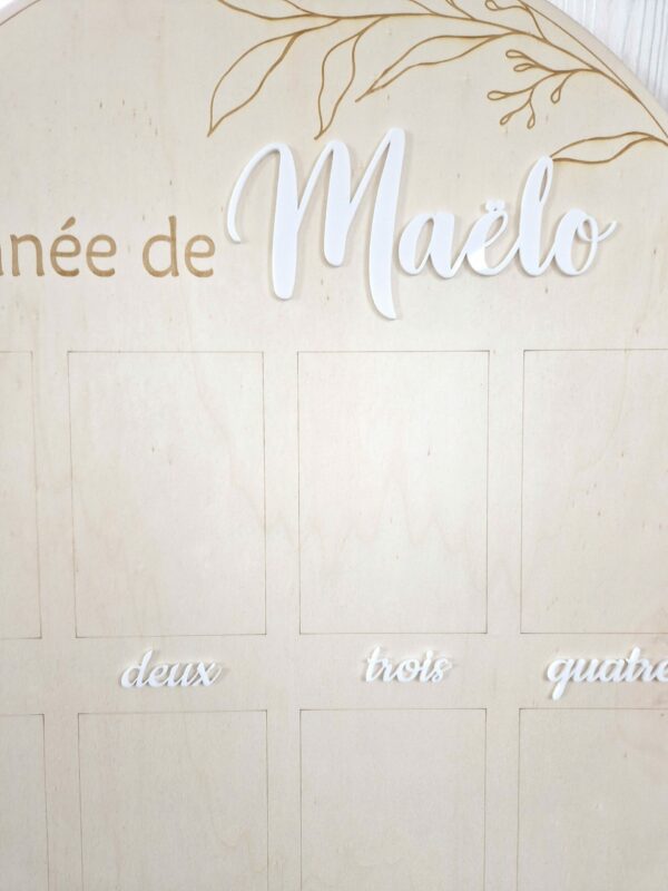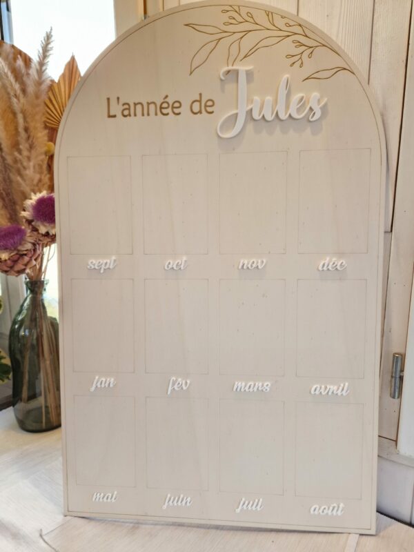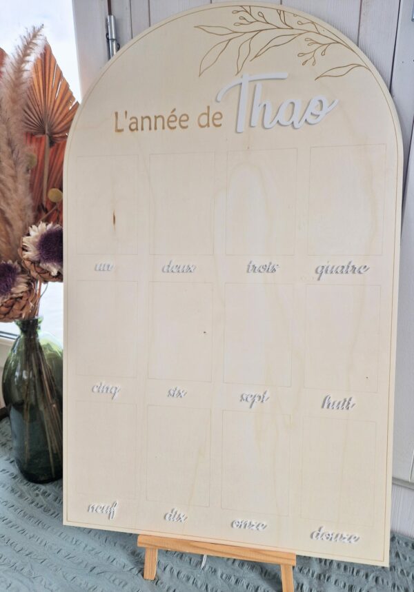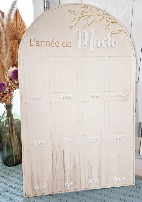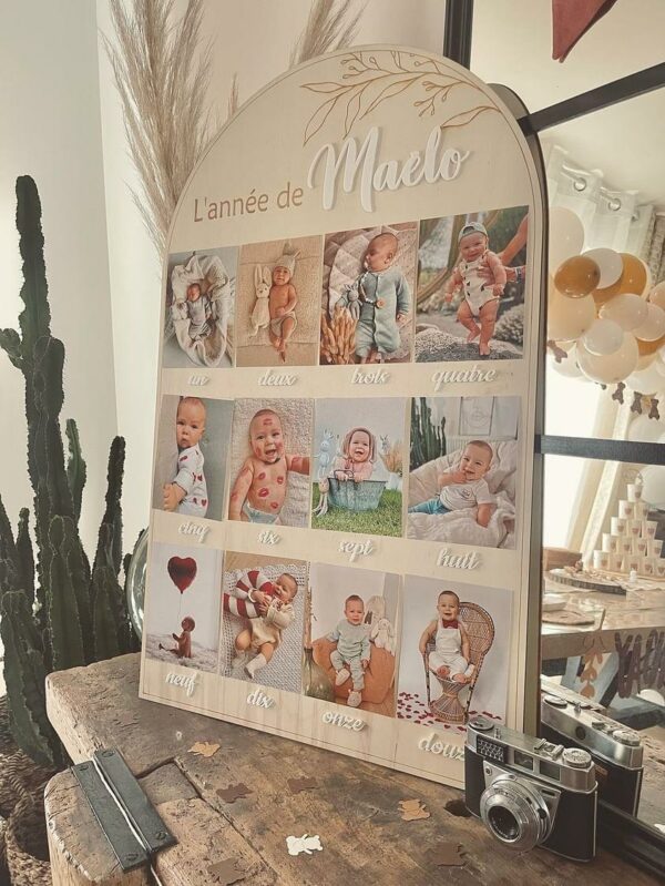 Grand panneau en bois en forme d’arche pour afficher des photos au format standard (10x15cm) des 12 premiers mois d’un bébé.