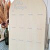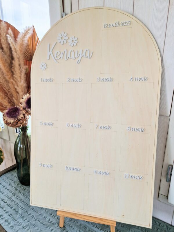 Grand panneau en bois en forme d’arche pour afficher des photos au format standard (10x15cm) des 12 premiers mois d’un bébé.