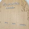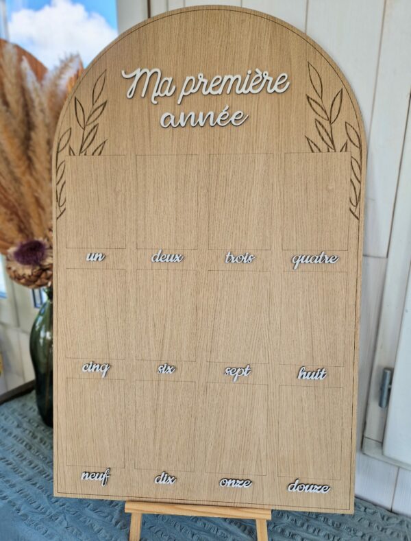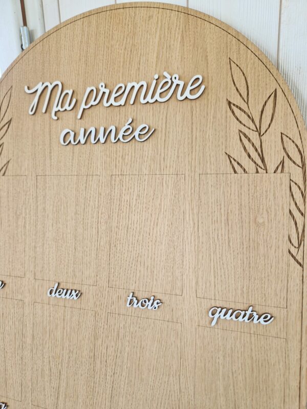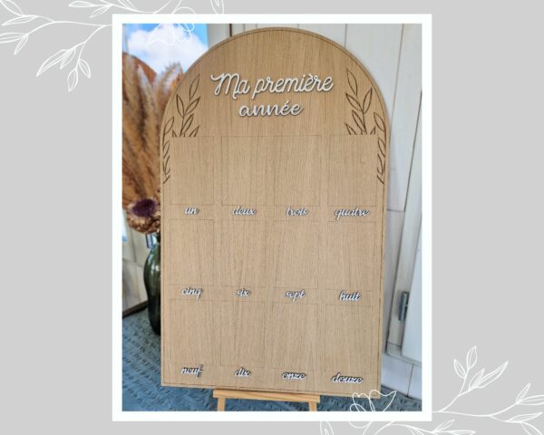 Grand panneau en bois en forme d’arche pour afficher des photos au format standard (10x15cm) des 12 premiers mois d’un bébé.