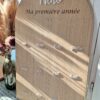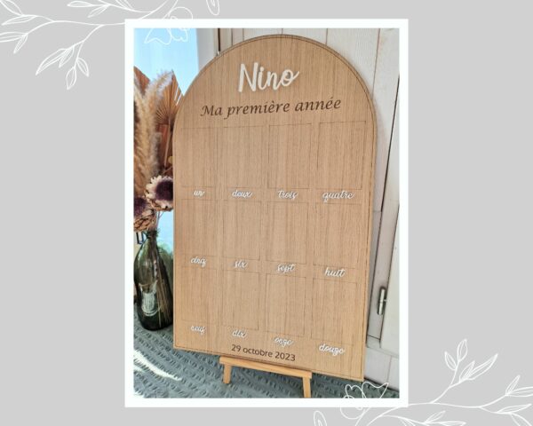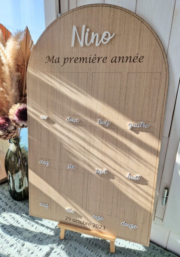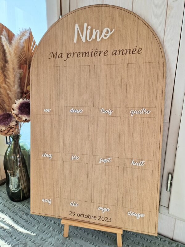 Grand panneau en bois en forme d’arche pour afficher des photos au format standard (10x15cm) des 12 premiers mois d’un bébé.