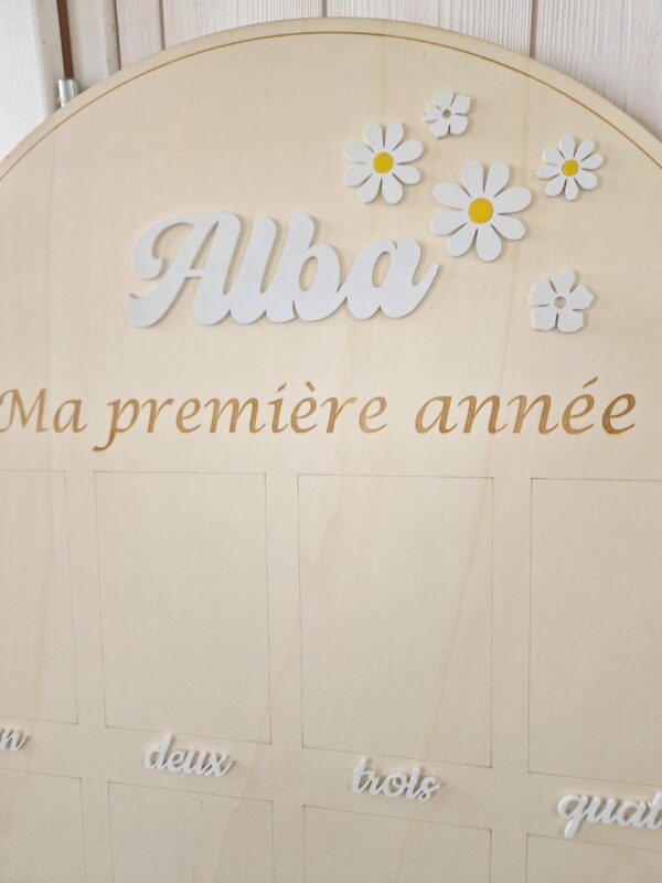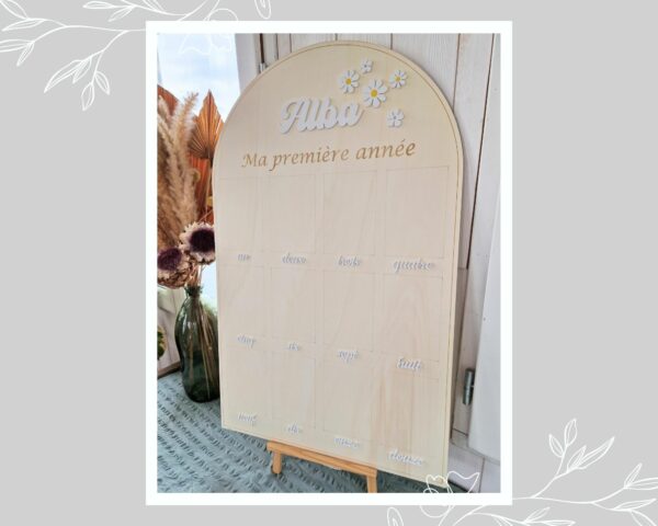 Grand panneau en bois en forme d’arche pour afficher des photos au format standard (10x15cm) des 12 premiers mois d’un bébé.