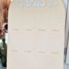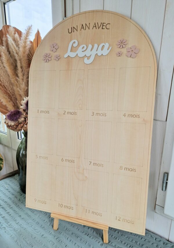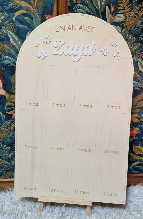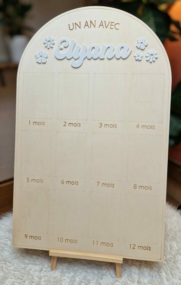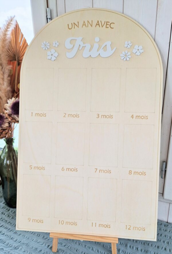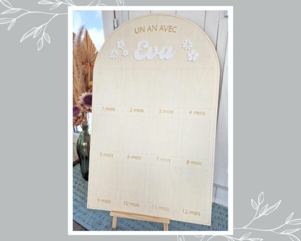 Grand panneau en bois en forme d’arche pour afficher des photos au format standard (10x15cm) des 12 premiers mois d’un bébé.