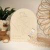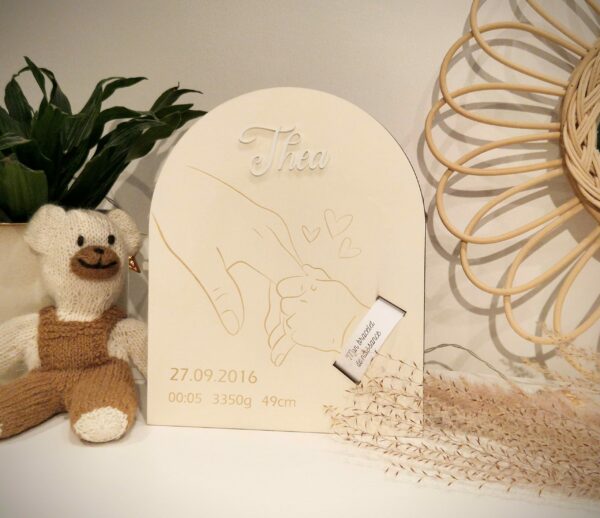 Personnalisée avec le prénom en acrylique blanc et les informations de naissance gravées (date, heure, poids et taille).